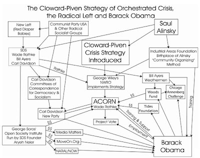 In attempting to capture the significance of Barack Obama's Radical Left connections and his relation to the Cloward Piven strategy, I constructed following flow chart. It is by no means complete. There are simply too many radical individuals and organizations to include them all here. But these are perhaps the most significant.